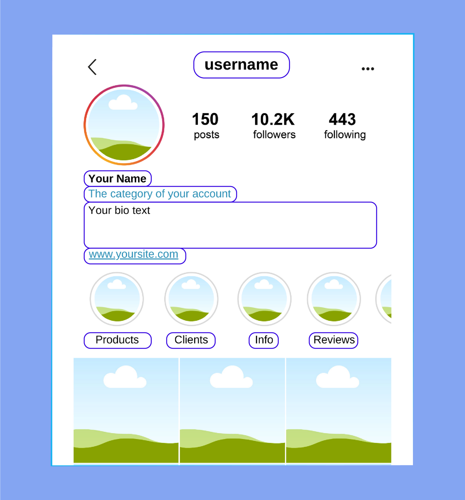 Update the editable fields (username, name, bio, links, and highlights) so everything matches your brand.