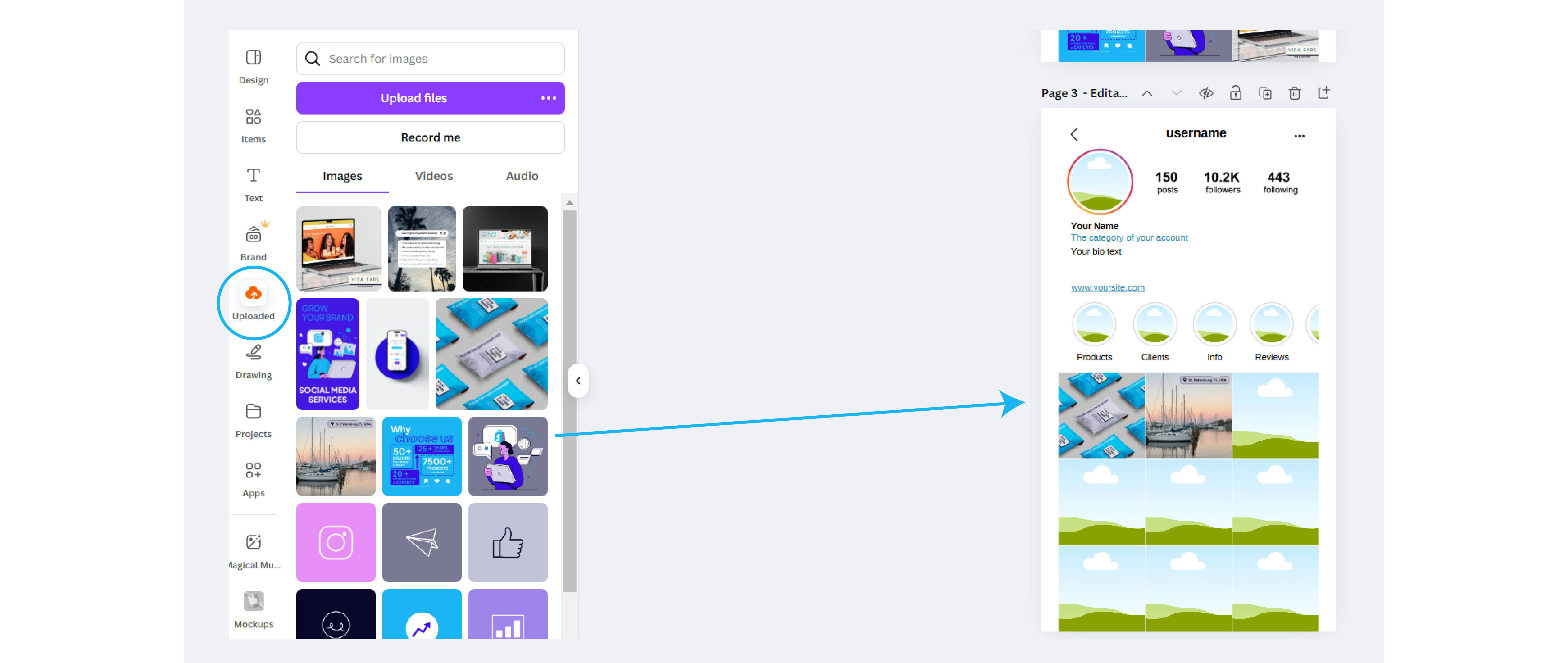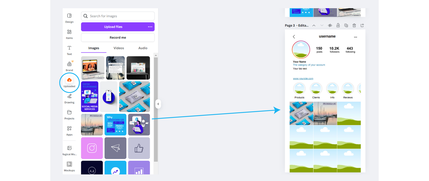 Drag your images into the grid to preview how your feed will look. You can also drop in your logo as the profile picture and customize highlight covers to complete your brand look.