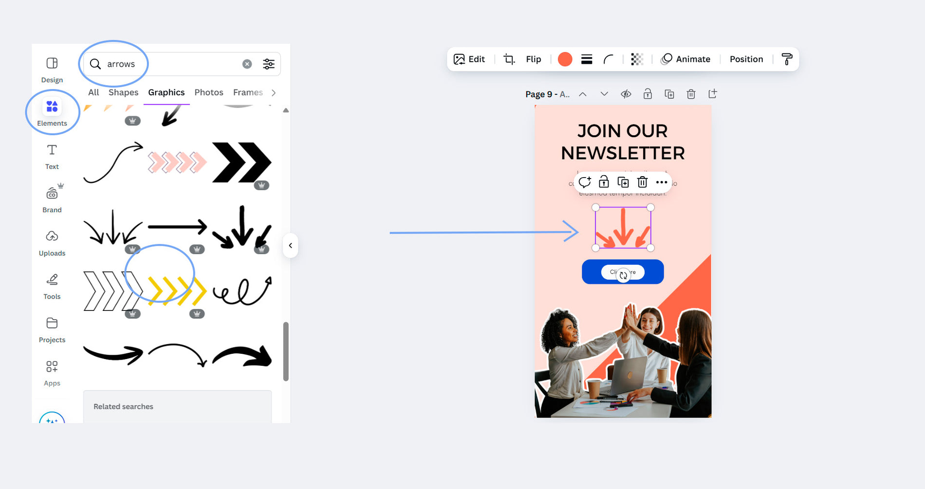 To insert an icon , image or illustration, go to the left sidebar and click on “Elements.” Type in the name of what you’re looking for, then click on the graphic you like. Once it appears on your design, drag and resize it to fit wherever you need.