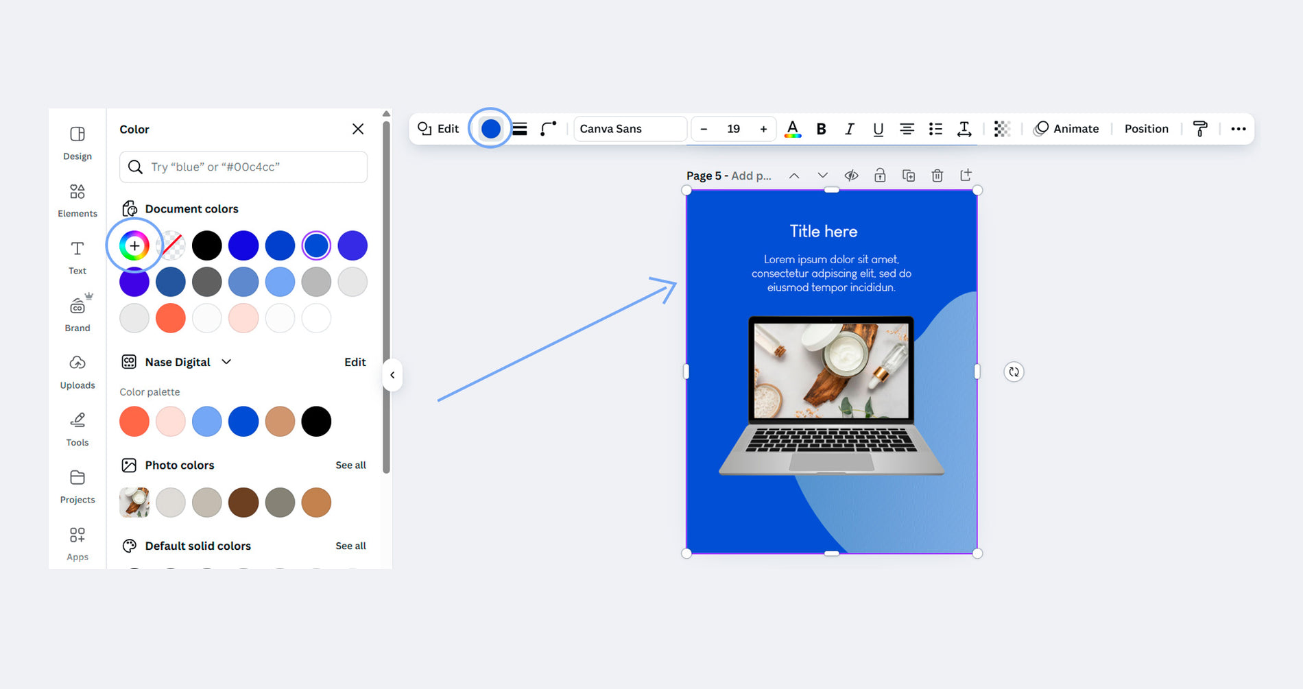 Click on the background area of the template, then tap the color circle in the top menu. On the right, you’ll see your color palette—pick one of those or use the color wheel to choose a custom shade.