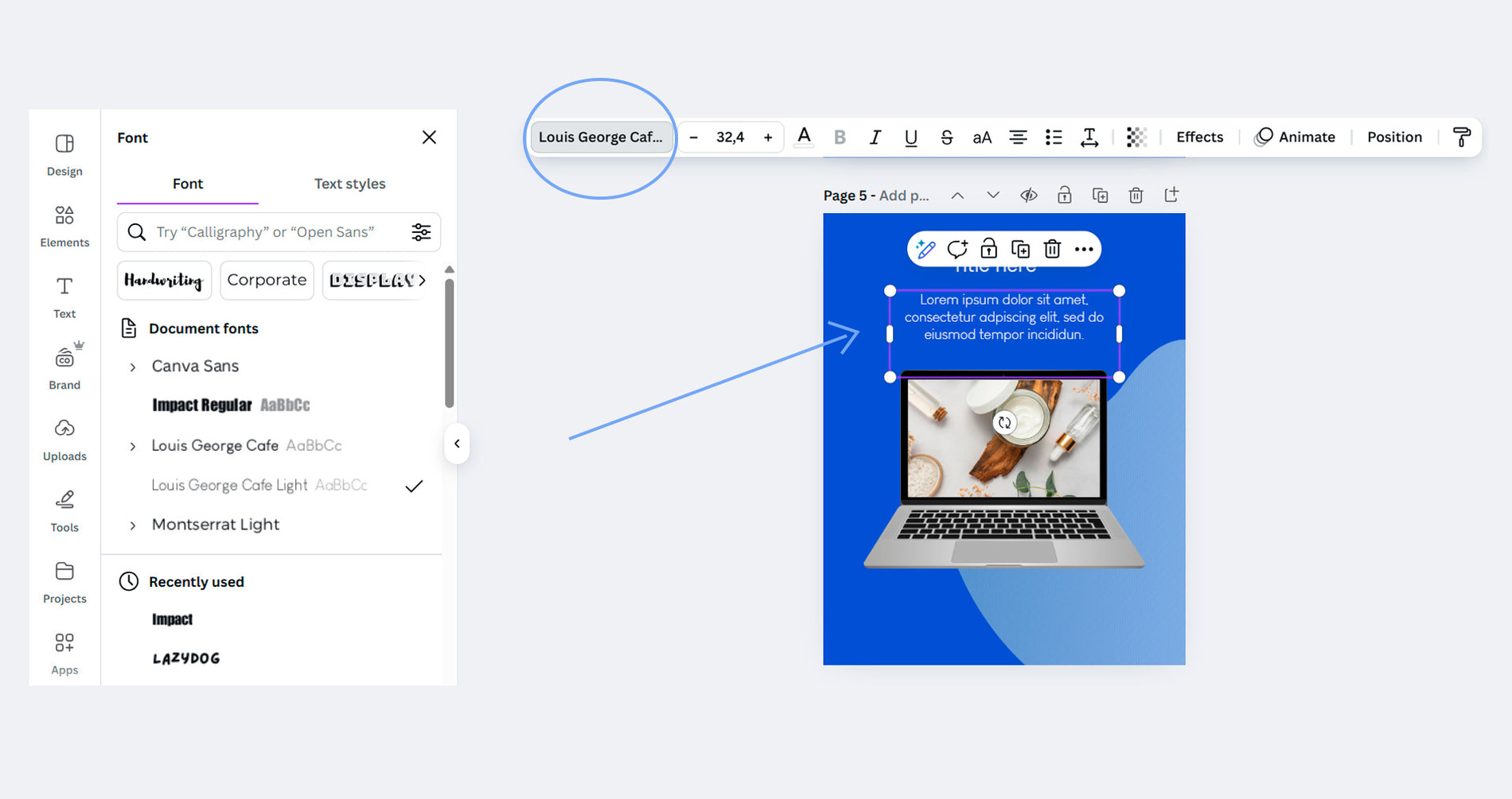 To change the fonts in your template, click on the text box you want to edit. Once selected, a top menu will appear—simply choose a new font from the dropdown where the current one is listed. You can also change another aspects such as color, and size in the same menu.