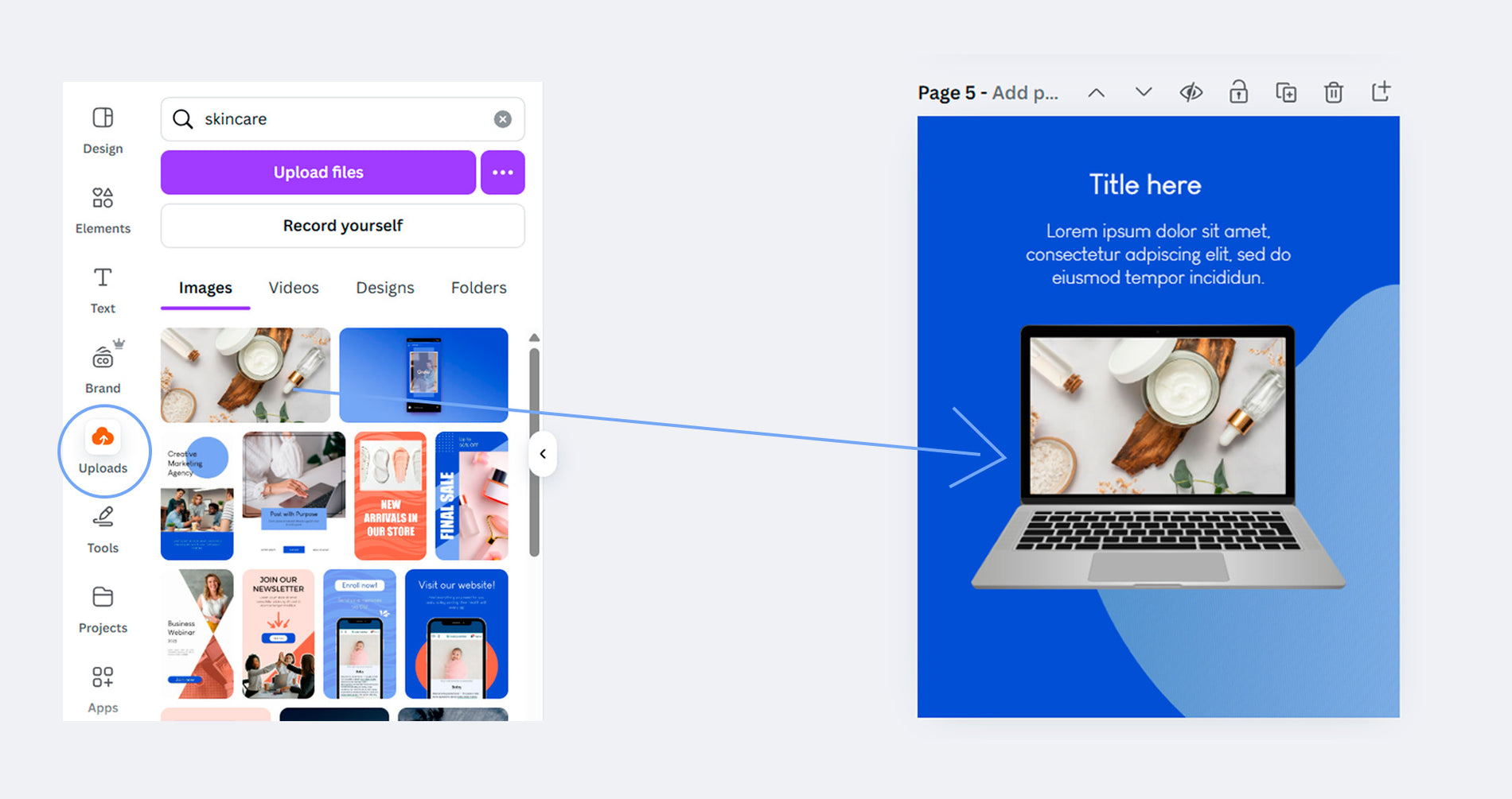 To do this, just go to the left sidebar, click on “Uploads,” upload your image, and drag it directly to the place where you want the image to be—it will position itself automatically (you can edit it afterward).